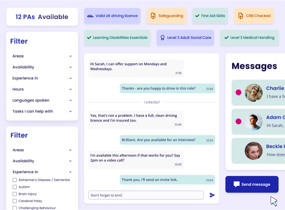 Our platform provides a single, streamlined way for people in your area to find and connect with Personal Assistants. It enables individuals to advertise roles, search for suitable candidates and manage the recruitment process themselves, all within one trusted digital space.
